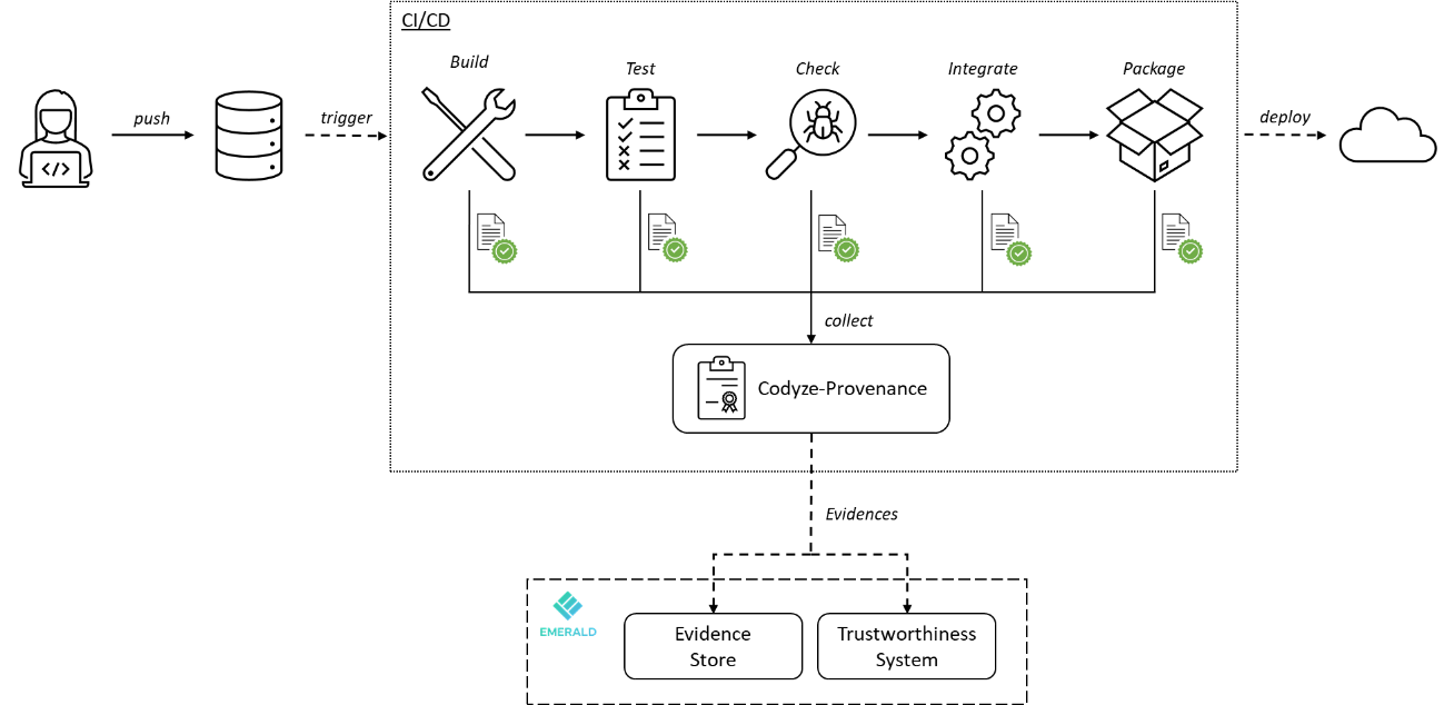 Codyze-Provenance collects the provenance reports from each step in the CI/CD pipeline. The reports are processed into evidences and aligned with the CertGraph Ontology (cf. D2.10). This structure permits further compliance assessment within the EMERALD framework. Finally, Codyze-Provenance submits the evidences to the Evidence Store and Trustworthiness System within the EMERALD framework (cf. D3.4).