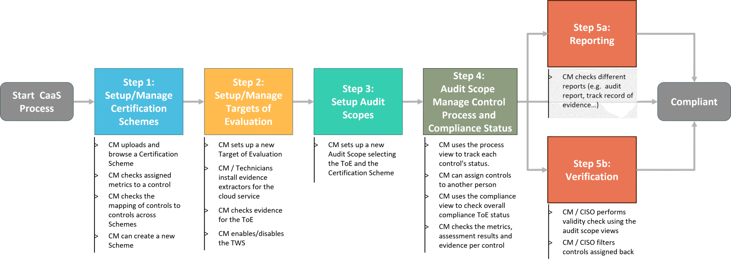 • Stream 2: Targets of Evaluations: Here, users can define what will be certified (for example, a cloud service), connect it with the right evidence extractor tools, and manage access rights for team members (see Figure 2).